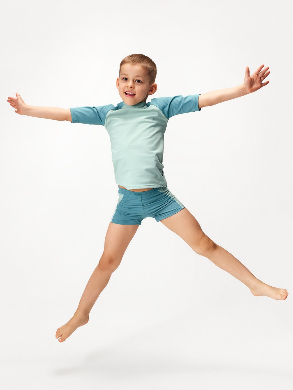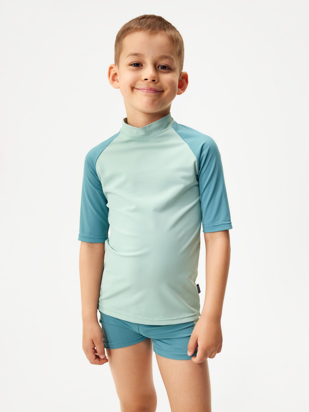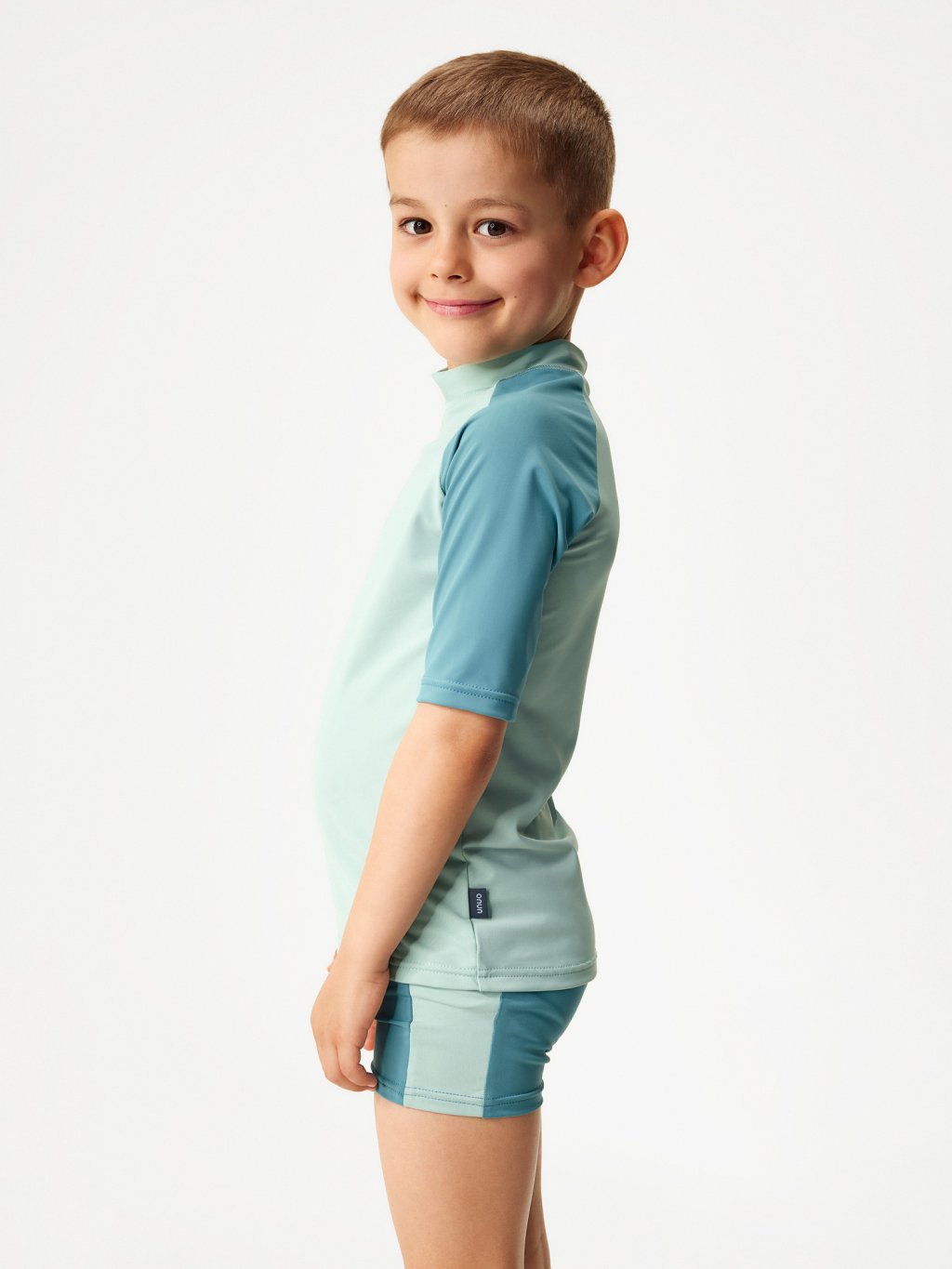 Die Kollektion ist aus hochwertigem italienischem Flockgewebe mit UV-Schutz 50+ gefertigt. Recyceltes Polyamid mit OEKO-TEX®-Zertifizierung sorgt dafür, dass die Kleidung umweltfreundlich und sicher für die Haut der Kinder ist. Darüber hinaus ist dieses Material schnelltrocknend, sehr angenehm im Griff und sorgt für maximalen Tragekomfort. Dank einer speziellen Technologie bei der Herstellung des Materials ist der UV-Schutz dauerhaft und wäscht sich auch nach mehreren Waschgängen nicht aus.