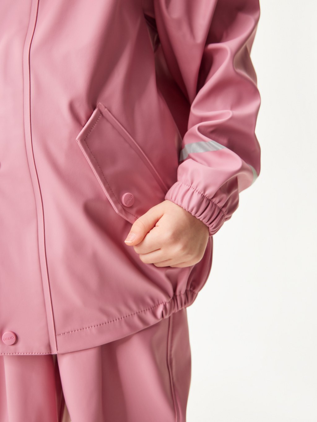 Regen, Wind, Pfützen und Schlamm? Kein Problem! Unsere wasserdichte Kinderjacke ist die ideale Wahl für kleine Abenteurer, die keine Angst vor jedem Wetter haben. Das gummierte Material mit dauerhaft versiegelten Nähten sorgt dafür, dass kein Tropfen Wasser ins Innere dringt. Die Jacke ist mit einer praktischen Kapuze ausgestattet, die den Kopf vor Regen und Wind schützt, so dass die Kinder auch bei schlechtem Wetter trocken und bequem bleiben. Dank der elastischen Bündchen an Taille, Ärmeln und Kapuze sitzt die Jacke perfekt und verhindert, dass sie nass wird. Reflektierende Elemente an Ärmeln, Kapuze und Rücken erhöhen die Sicherheit der Kinder bei schlechten Sichtverhältnissen. Reißverschlüsse und Druckknöpfe mit dem unuo-Logo erleichtern das Anziehen und die praktischen Taschen für kleine Schätze sind mit Druckknöpfen verschließbar, damit nichts herausfällt. Mit dieser Jacke können Kinder jedes Outdoor-Abenteuer genießen, ob sie nun in Pfützen springen oder Waldwege erkunden! Die wasserdichte Kollektion wird in der Tschechischen Republik entworfen und in einer ausländischen Näherei genäht.